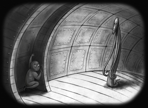 Пятнистый молча кивнул своей маленькой головой, и Плоский двинулся к выходу. Живулька последовал за ним обратно в пещеру. Когда проводник остановился, на первом ярусе зашевелилось какое-то странное вытянутое существо, состоявшее, кажется, из длинного юркого хвоста и огромной головы, увенчанной гибкой воронкой.