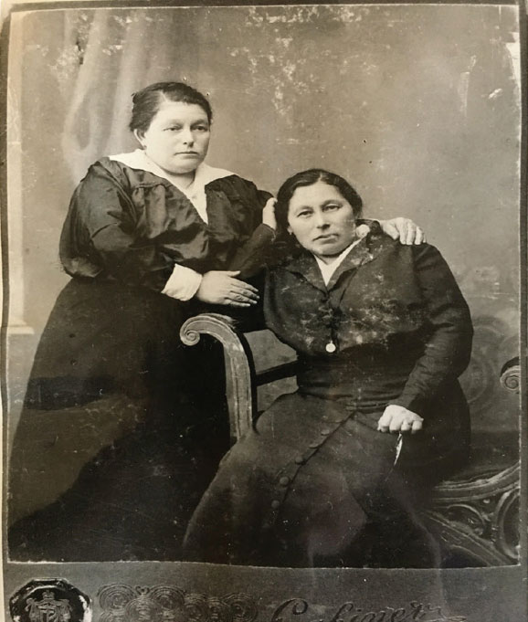 Моя прабабушка Софья Григорьевна Книгер, жена П. Б. Книгера (стоит) и её сестра Хая Лившиц (сидит). На обороте печать: «5-тиминутная фотография, г. Полтава».