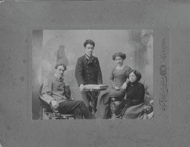 Мой дедушка, Г. И. Ломовский (стоит в центре) и моя бабушка, Л. П. Ломовская (сидит справа) со своими близкими друзьями Евгенией Павловной и Иосифом Матвеевичем Розиными. 1910 год, г. Харьков. На бабушке бархатное платье, в руках изящная муфта, у неё красивая и сложная причёска. Ручка кресла, на котором сидит бабушка, заканчивается головой какого-то животного. Перед дедушкой лежит старинная книга, наверное, собственность фотографии. Дедушка – ещё студент Императорского Харьковского университета.