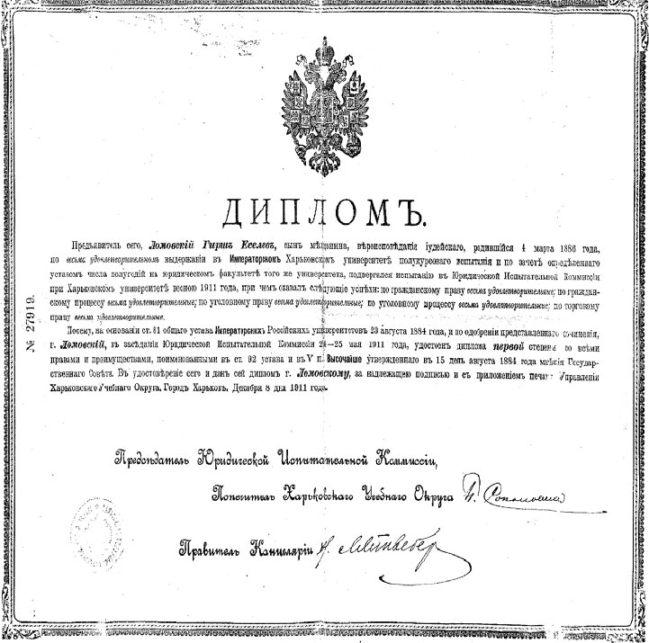 А вот и диплом моего дедушки Г. И. (Гирша Еселева) Ломовского об окончании в 1910 году юридического факультета Императорского Харьковского университета (диплом первой степени об окончании университета, выданный декабря 8 дня 1911 года, хранится в моем архиве).