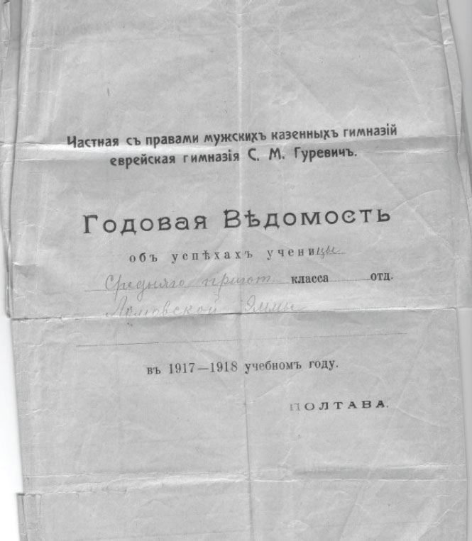 Обложка Годовой ведомости об успехах ученицы среднего приготовительного класса Ломовской Эммы в 1917–1918 учебном году, Полтава, с правами мужских казённых гимназий еврейская гимназия С. М. Гуревич. Правописание дореволюционное с твердым знаком и «и» с точкой.
