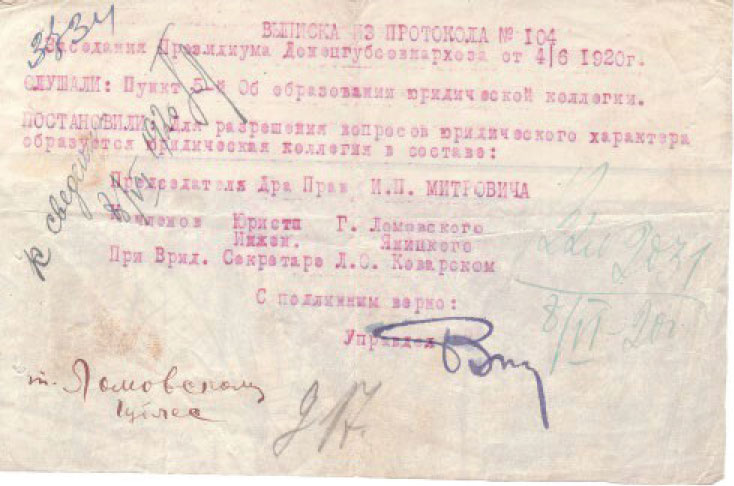 Выписка из протокола № 104 Заседания президиума (неразб.) от 4/6/1920.