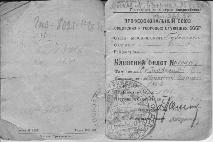 Первая страница профсоюзного билета моего дедушки Г. И. Ломовского. Можно различить с трудом, что билет был выдан ему как члену профсоюза в 1918 году. Конечно, этот билет должен быть изучен специалистами архивов. Сверху наш домашний адрес в Москве по Малой Бронной, написанный уже позднее.