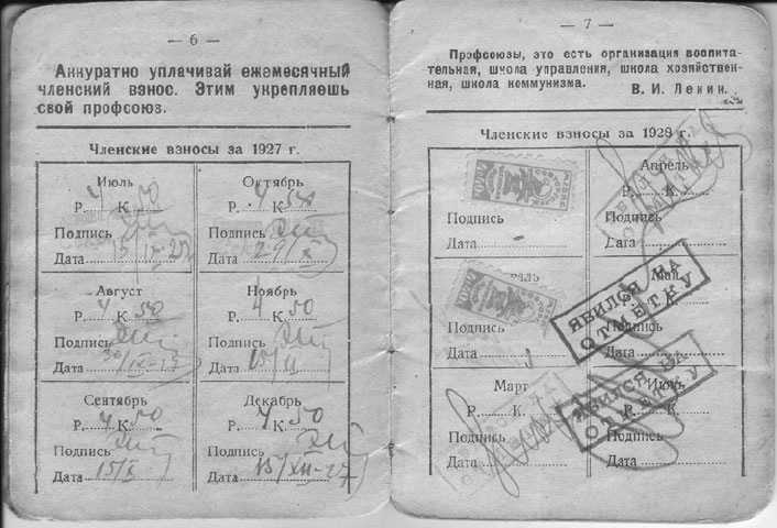 Этот же профсоюзный билет открыт на странице об уплате профсоюзных взносов за 1927 и 1928 годы. На каждом месяце за 1928 год пометка: явился на отметку. Всех держали даже через профсоюз на заметке.