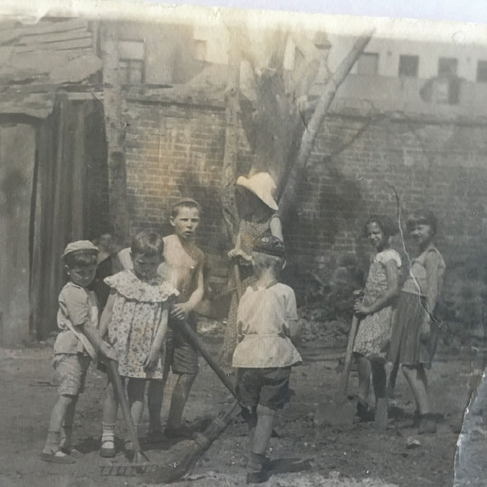 На субботнике в нашем дворе на Малой Бронной улице (конец 20-х?). Третий слева Муся Кафенгауз, сосед с первого этажа (погиб в самом начале войны в 1941 году). Вторая справа моя тётя Валя (Валентина Григорьевна Ломовская). В центре её близкая подруга Галя Сельцовская.
