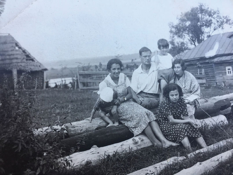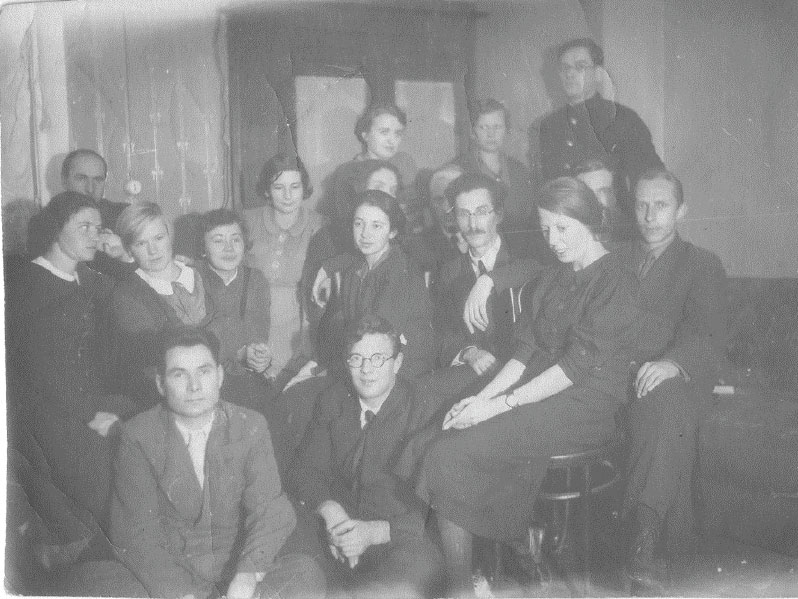 Кропотово, вторая половина 30-х. Сидят: в первом ряду моя (Н. Л.) тётя Валя, во втором ряду: слева направо: я, моя мама Муся Ломовская, Дмитрий Шаскольский, его дочь Наташа Шаскольская, мама Наташи Ольга Григорьевна Гольцман.