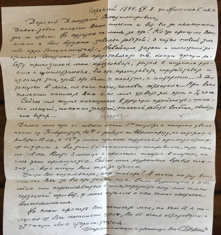 Оригинал письма Сергея Сергеевича Четверикова, посланного моему папе Д. В. Шаскольскому через несколько месяцев после сессии ВАСХНИЛ, круто изменившую к худшему и без того непростую судьбу выдающегося учёного. Перепечатанное письмо приводится в этой главе.