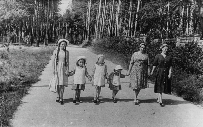 В воскресный день на даче в Луцино под Москвой (начало 50- х). Слева направо: я (Наташа Л.), Вера (дочь Марианны Петровны), Таня (дочь Тамары Петровны), Майя (дочь Марианны Петровны), моя мама Эмма Григорьевна Ломовская и Тамара Петровна Шаскольская. Фотографирует, наверное, Марианна Петровна Шаскольская.
