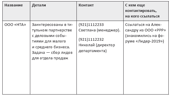 • контакт (имя, фамилия или данные нескольких человек, если у вас по этой компании несколько контактов);