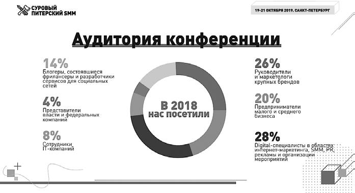 Поэтому подробно расписывайте, какие категории участников к вам придут. Можно также поставить в презентацию диаграмму с процентным соотношением долей участников (если у события есть история и материалы для построения аналитики). Но не перегружайте свою презентацию, не превращайте ее в аналитическую справку «Наше событие за прошедшие годы». Конкретно в данной презентации это не один (что возможно, если есть из чего строить графики и аналитику), а два слайда, и они выглядят следующим образом.