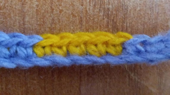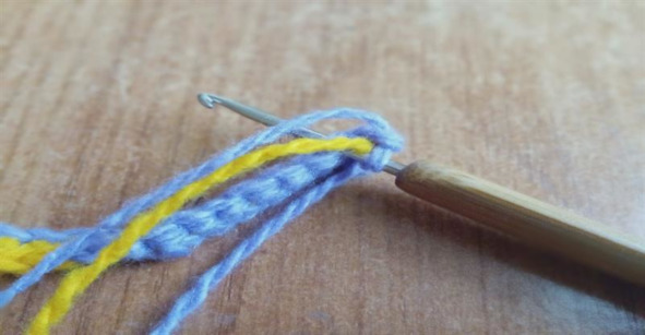 По окончании ряда поворачиваете вязание и укладываете нерабочую нить, или нити на основу предыдущего ряда. Если вы делаете петлю подъема, то пропускаете первую петлю ряда, ее замещает петля подъема. Этот принцип для любого вязания крючком столбиками без накида в начале ряда.