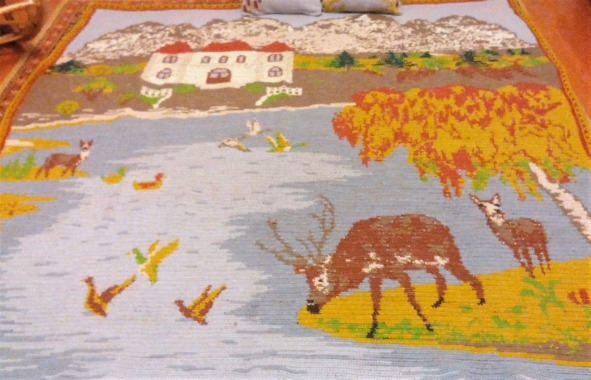 Размер этого гобелена 240 на 250 см. Связан поворотными рядами по мотивам вышивки крестом «На водопое». Гобелен вязался без схем по картинке и поперечно начиная с одного бока и заканчивая другим.