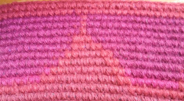 При смене цвета столбик заканчивается нитью нужного цвета. А ненужную в работе нерабочую нить укладываем на петли предыдущего ряда. Почему так? Потому что сначала на крючке образуется петля, а потом мы вяжем под ней столбик. Меня часто спрашивают, почему при вязании, особенно по кругу у меня не «съезжает» рисунок. Именно потому, что исходя из вышесказанного столбик располагается точно под петлей и над столбиком нижележащего ряда соответственно схеме рисунка. Это же относится и к окончанию ряда. Петля на крючке по окончанию ряда это петля первого столбика следующего ряда если не считать петли подъема.
