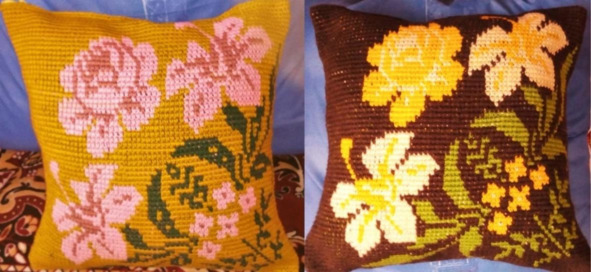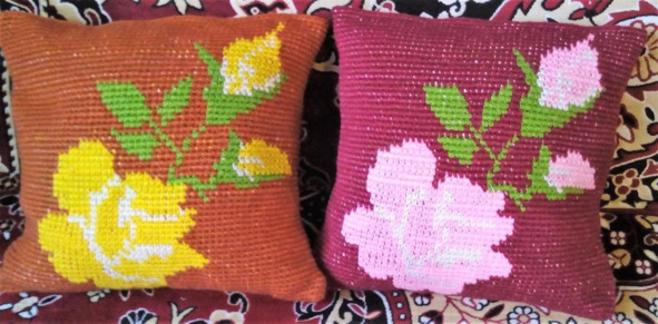 Подушки связаны по схемам для филейного вязания и немного «разбавлены» цветом:
