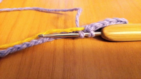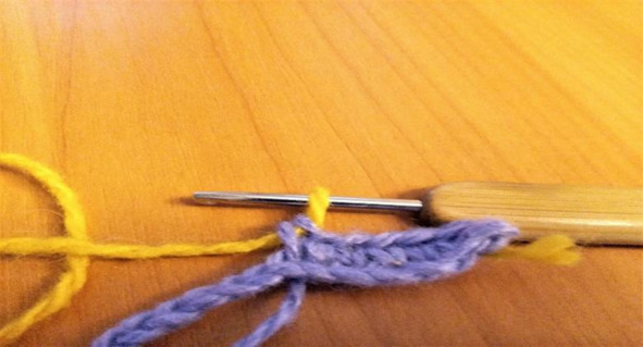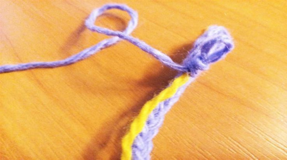 В набранную цепочку из воздушных петель начинаем вязать столбики без накида, сразу закрывая ими нерабочую нить, которая укладывается на эту цепочку, а в дальнейшем на предыдущий связанный ряд.