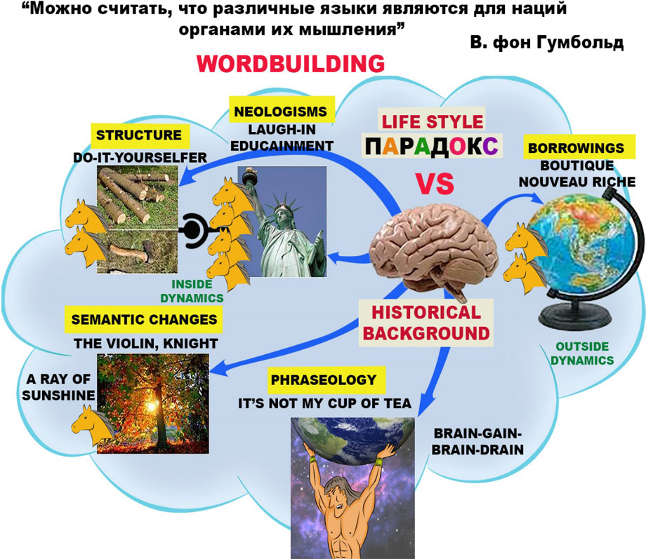 Посмотрим на карту 1, на которой представлена общая картина образования слов и, в частности, неологизмов. Столкновение исторических традиций historical background и современного стиля жизни life style. В этом парадоксальном противостоянии рождаются неологизмы не без помощи логического мышления, символически показанного в виде мозга.
