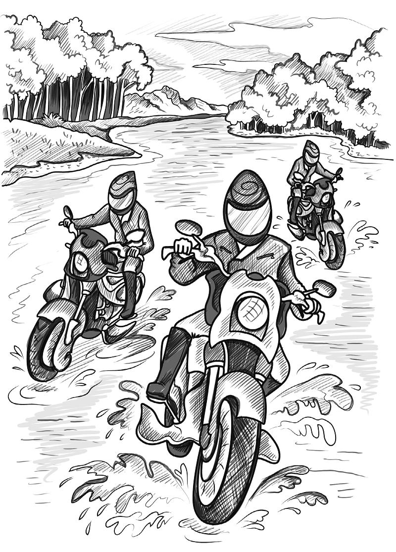 Вдалеке показались несколько незнакомцев на огромных мотоциклах. Они стремительно приближались, и, хотя колёса едва касались поверхности воды, брызги летели во все стороны.