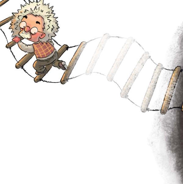 В это мгновение на чердаке послышался шорох. Люк в потолке открылся, из него показалась верёвочная лестница и, раскручиваясь и извиваясь, помчалась вниз. Затем в дыре появились потёртые башмаки, холщовые штаны, клетчатый жилет и голова с растрёпанными седыми волосами, круглыми очками и улыбкой во всё лицо.
