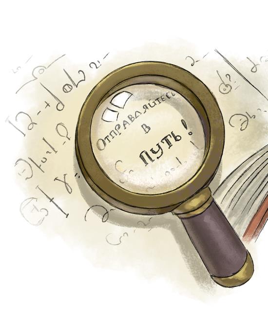 Он порылся в карманах, извлёк необычный прибор и поднёс к книжной странице. Попав под прицел чудесного стекла, буквы заплясали, запрыгали и, словно сменив одежды, превратились в обычные письмена.