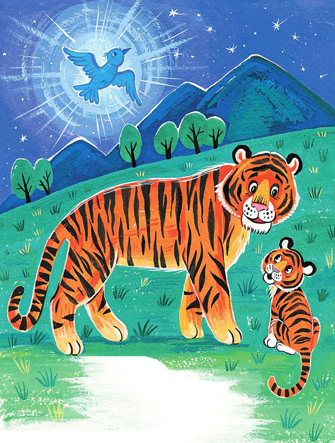 Изумлённый тигрёнок выпустил добычу. Птица взмахнула крыльями и полетела. В вышине её голос зазвучал как детский смех, как колыбельная мамы-тигрицы. И в тёплых сумерках её перья снова вспыхнули синим пламенем.