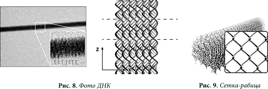 Посмотрите, разве вы видите какую-то разницу между спиралями ДНК, плетением бисером или сеткой «рабицей»? Если бы не подписи под картинками, вы бы их перепутали.