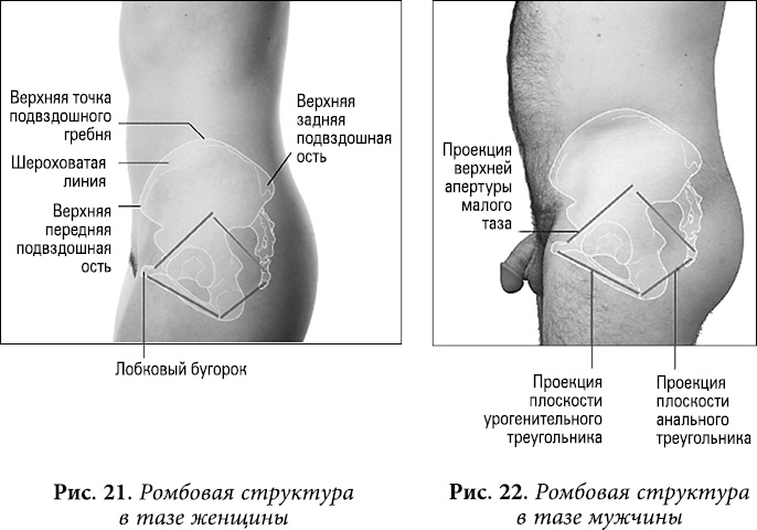 Если посмотреть на костную структуру таза снизу, можно увидеть четыре выступающих части: лобок, копчик и два седалищных бугра. Вместе они составляют четыре угла промежности, как полагают медики, «имеющей форму бриллианта».