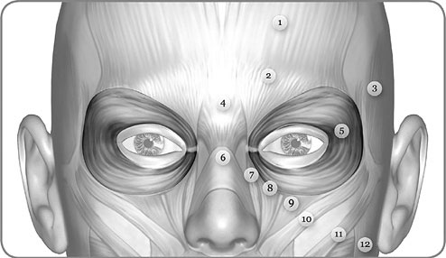 Рис. 2.3. Мышцы, влияющие на биомеханику старения глаз: 1 – лобная мышца; 2 – мышца, сморщивающая бровь; 3 – височная мышца; 4 – мышца гордецов; 5 – круговая мышца глаза; 6 – носовая мышца; 7 – мышца, поднимающая верхнюю губу и крыло носа; 8 – мышца, поднимающая верхнюю губу; 9 – мышца, поднимающая угол рта; 10 – малая скуловая мышца; 11 – большая скуловая мышца; 12 – жевательная мышца