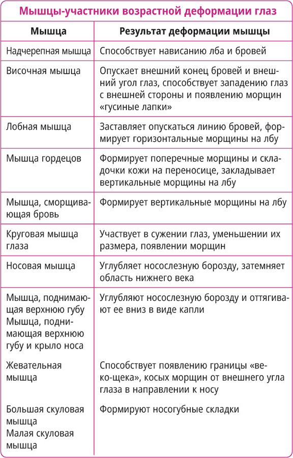 Особо «продвинутые» специалисты свяжут старение глаз не только с увяданием нежной кожи, но и с деформацией мышц, окружающих глаз, причем чаще всего с их атонией. К примеру, довольно часто можно услышать от косметологов такие сентенции: «Круговая мышца глаза с возрастом слабеет, поэтому и появляются морщины». На самом деле принцип остеопатии гласит: морщины и складки вызываются, наоборот, гипертонусом мышц, то есть не их ослаблением, а спазмом.