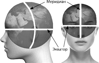Немного усложним образ воздушного шарика и представим человеческую голову в виде глобуса – географической модели земного шара (рис. 3.4), на котором есть свои меридианы и параллели.