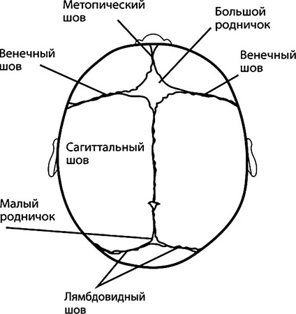 Область черепа является особой зоной риска, возникающего из-за родовых или прижизненных травм. В момент рождения открытые зоны черепа – так называемые роднички – позволяют костям черепа сужаться, помогая ребенку проходить через узкие родовые пути. С возрастом все роднички, включая большой (самый крупный из шести имеющихся у младенца), затягиваются. Тем не менее взрослому человеку можно обнаружить его, легко пальпировав голову. Обычно это место несколько мягче остальных и выглядит как небольшая ямка ромбовидной формы (рис. 3.6).
