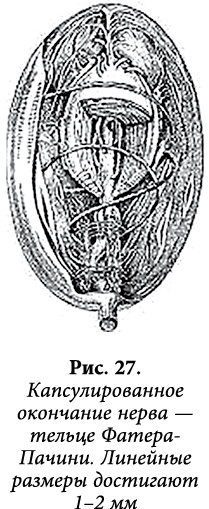 Весьма разнообразны чувствительные окончания в соединительной ткани. К таким «бусинкам» можно отнести осязательные тельца (тельца Мейснера), генитальные тельца, капсулированное «тельце Фатера-Пачини» (ТФП), названное так в честь открывшего его итальянского анатома Филиппа Пачини (1812–1883). ТФП в изобилии присутствуют в подкожном слое ладоней и стоп, в женских гениталиях и в соединительных тканях внутренних органов.