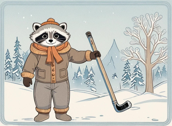 Как-то зимним днём енотСобираться стал на лёд.Клюшку взял, коньки в охапку.Натянул на ушки шапку.Шарф на шею накрутил,Про перчатки не забыл.День чудесный, стихла вьюга, —Не хватает только друга!