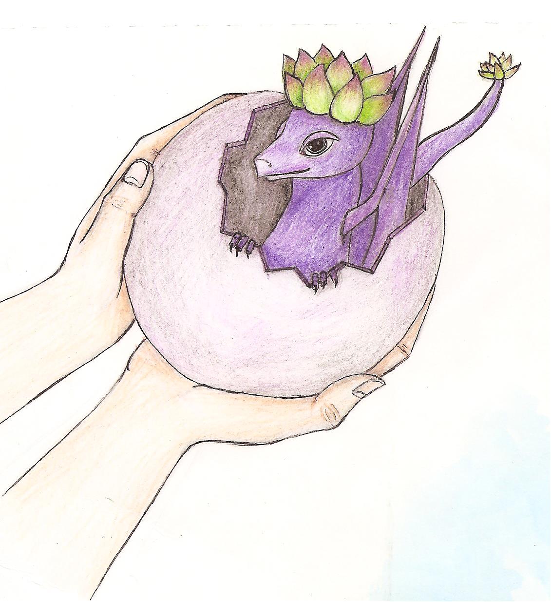 Верхушка упала, а из своего «кокона» выполз маленький дракончик. Он был размером с ладонь, фиолетового цвета. Огромный глазки изумрудного оттенка, маленький хвостик с цветочком на конце; крохотные лапки и аккуратные крылышки. На голове у него был огромный суккулент, а сам он, осмотрев хозяйку и её начальника, вытащил язык и издал лишь звук «Пф».