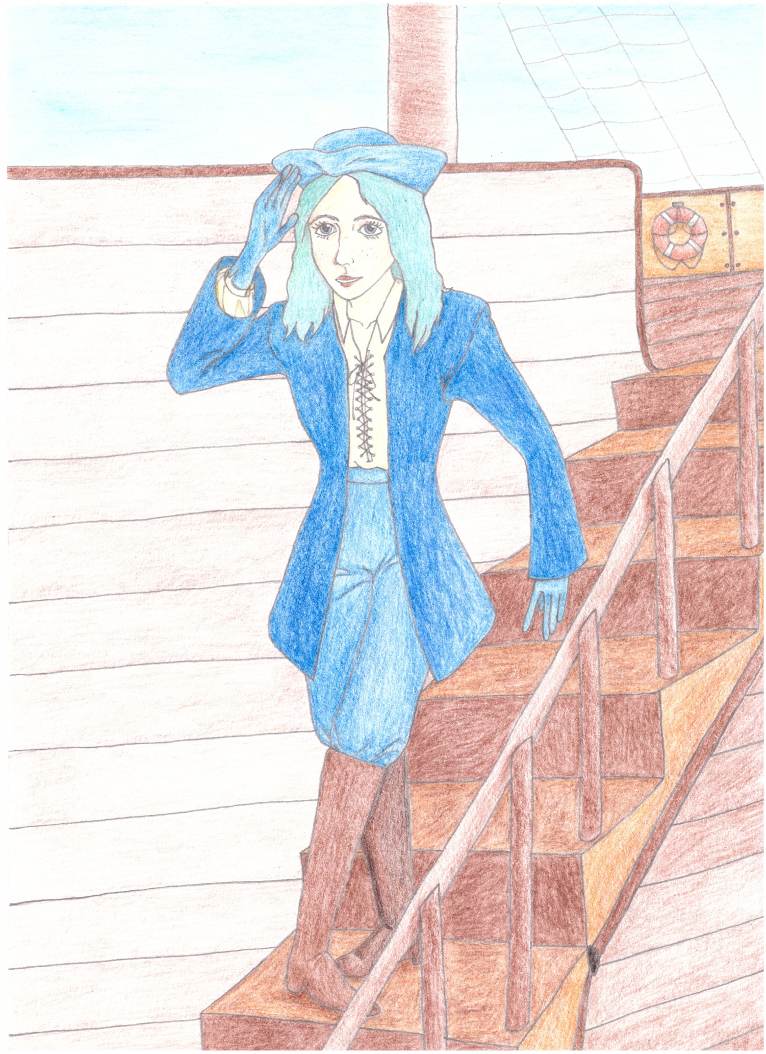 Бирюзовые, короткие волосы закрывали слегка её плечи, большие голубые глаза с интересом разглядывали гостей. Крохотный горбик на носике, розовый румянец и веснушки на лице, которые еле различались на загорелом лице – всё это интересно дополняла её образ. На ней были белая сорочка из льна со шнуровкой вместо пуговиц (но на размер больше и потрепанная), темно-синие кюлоты, длинные до колена кожаные сапоги, украшенные кружевами камзол и синие атласные перчатки. Обычная пиратская шляпа была ей большой, поэтому съезжала на лоб, закрывая брови.