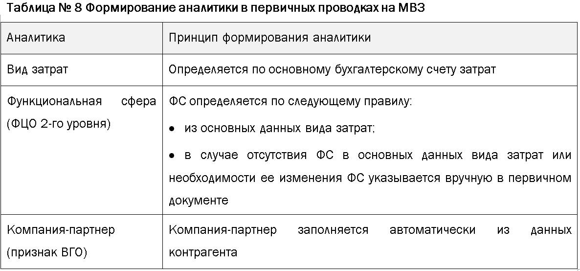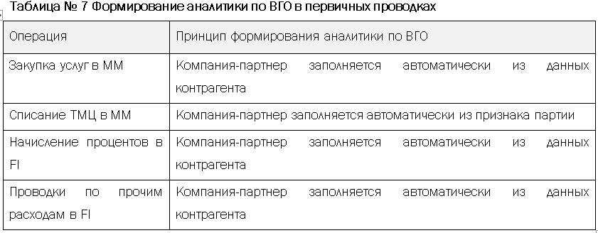 При первичных проводках по закупке услуг, списанию ТМЦ, прочих расходах, связанных с контрагентами, выделение внутригрупповых операций предусмотрено через аналитику «компания-партнер». В системе аналитика по внутригрупповым оборотам (ВГО) при проведении первичных затрат формируется по принципу, описанному в таблице: