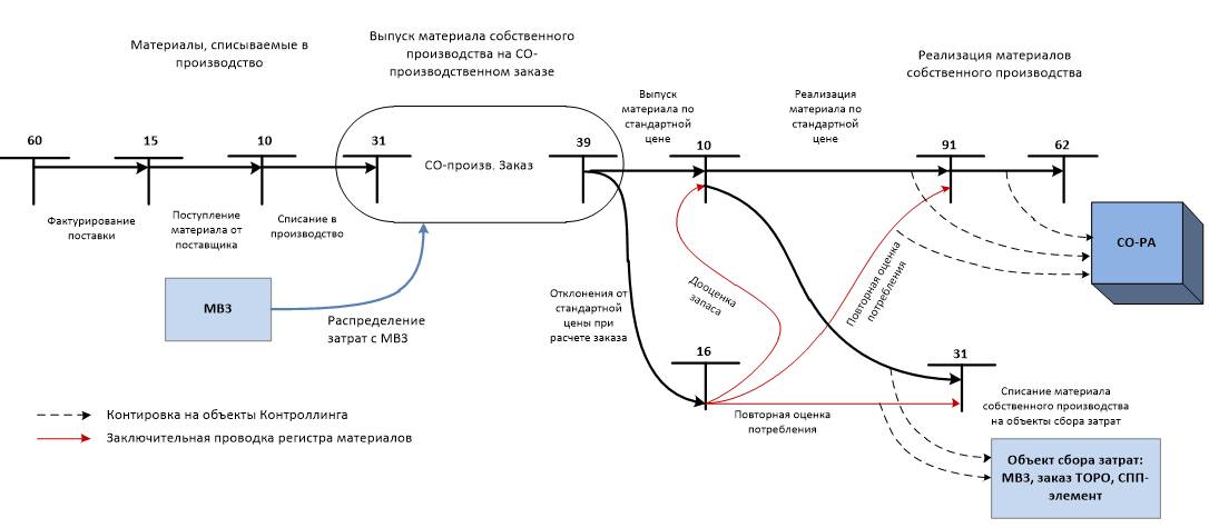 При закрытии периода и расчете фактической себестоимости в Контроллинге фактические отклонения от стандартной цены производимого материала переоценивают все направления потребления этого материала в периоде и остаток запаса.