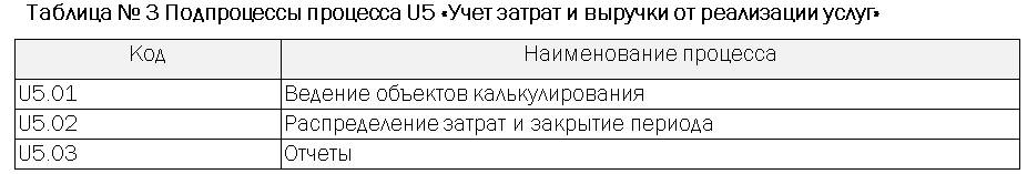 Процесс второго уровня U5 «Учет затрат и выручки от реализации услуг» включает в себя следующие подпроцессы: