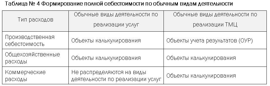 учет и распределение затрат, формирующих производственную себестоимость на объектах калькулирования, по реализации услуг в части основных и неосновных обычных видов деятельности;
