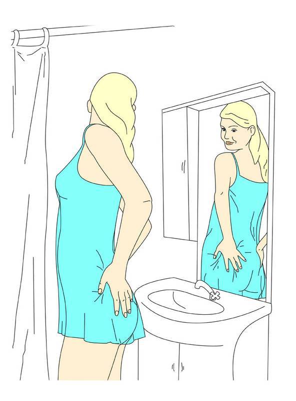 Зинка находилась в ванной и пыталась в зеркале разглядеть достоинства своего 30-летнего тела. Она поворачивалась к зеркалу то одним боком, то другим, воображая себя моделью. Потом пыталась втянуть живот и приподнять грудь.