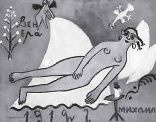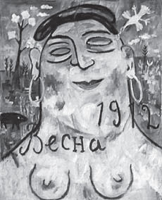 Однако нарушенное равновесие тут же восстанавливается в мотиве дерева, которое присутствует во всех четырех картинах. Своим вегетативным статусом дерево каждый раз маркирует тот или иной сезон (голое дерево – зимой, зеленеющее – летом, усыпанное плодами – осенью, расцветающее – весной). На двух композициях, между тем, есть и добавочные мотивы – древо искушения весной и свадебное деревце, по сторонам от которого друг напротив друга расположены жених и невеста, – осенью. Мотив отсылает к Мировому дереву – центральному символу архаической картины мира. Вокруг деревьев кружатся птички, по форме напоминающие рождественские пряники: пернатые выступают мифологическим классификатором, отмечающим верх. Посредством эквивалентных связей птицы = дерево (мировое дерево), птицы = дева, мотивы дерева/ птиц и Девы связываются между собой. Все это усиливает мифологическое звучание ларионовской Венеры, ее архаическую символику, в которой демоническое, идущее из низовых глубин женское начало сплетается воедино с сакральным верхом, отсылая к мотиву брака неба и земли. Возникает ассоциация с демонической Лилит из стихотворения Н. Гумилева «Ева или Лилит» 1911 года: У Лилит – недоступных созвездий венец, / В ее странах алмазные солнца цветут[10]. Создавая лубочно-игровой парафраз архаических символов, художник посмеивается и над символистскими клише, стремясь, одновременно «называя» и осмеивая их, опрокинуть недавнее прошлое культуры Серебряного века.