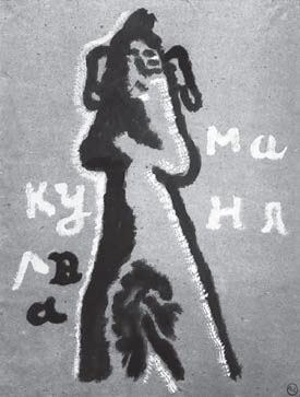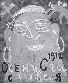 Четвертый тип изображений в каждом полотне представлен рукописными текстами [илл. 27]. Это «народно-поэтические» описания смены времен года. Балаганно-ярмарочные полустихи, полуречевки – тексты основаны на принципе произвольного членения слов при переносе в новую строку и декоративного (относительно равномерного – принцип народного орнамента) чередования цвета букв. Частичные внутренние рифмы соответствуют и частичности изобразительных «рифм». Лубку художник следует и в параллелизме изображения/слова, хотя этот параллелизм и неполный: так, словесная осень – «блестящая как золото» – не соответствует изображению, в котором доминируют синие тона. В весело приплясывающих буквах, орфографических ошибках очевидно влияние футуристических книг, которыми Ларионов и Гончарова в эти годы занимались. Принцип произвольного членения слов при переносе на новую строку предвосхищает идею А. Крученых о расчленении слова с целью расподобления смысла, которую он сформулировал в статье «Слово как таковое» годом позже (1913). В этом манифесте Ларионов в числе художников не упоминался, но выдвинутые принципы схожи: «1. Чтоб писалось и смотрелось во мгновение ока! (пение, плеск, пляска, разметывание неуклюжих построек, забвение, разучивание <…> 2. Чтоб писалось туго и читалось туго неудобнее смазных сапог или грузовика в гостиной (множество узлов, связок и петель и заплат, занозистая поверхность, сильно шероховатая)» [Крученых, Хлебников 2008].