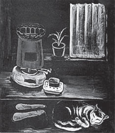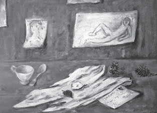 Выстроенность композиции как речи, сказовая интонация повествования и акцентированная субъектность рассказчика позволяют применить к картине категории теории речевых актов, т. е. рассмотреть данный визуальный нарратив как иллокутивный акт, где осуществлено приобщение зрителя/читателя ко времени актуального события, одновременного рассказу, и вещи выступают как знак настоящего. Откуда же это ощущение, что натюрморт несет в себе нечто зловещее? Можно утверждать, что, хотя в рассказе вещей акцентировано настоящее, коммуникативный жест направлен в прошлое и будущее. Прошлое – это воспоминание об автокоммуникативности авангарда, а будущее отмечено модальностью призыва. Содержание этого призыва становится более ясным, если учесть, что произведение не кончается рамками полотна, и очевидно, что сама ситуация речевой коммуникации призывает ввести в интерпретацию фактор контекста.