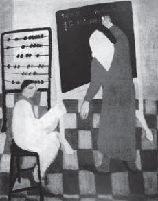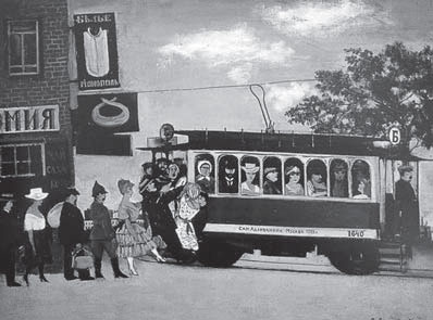 Изображение можно уподобить устной речи и по признаку стилизации примитива в стиле композиции. Известно, что в эти годы Г. Рублев был увлечен творчеством «наивного» грузинского художника Нико Пиросмани. В духе примитива решены и многие другие произведения мастера, среди них – «На даче» (1929), «Парикмахерская» (1928), «Ликбез» (1930) [илл. 32]. Кроме того, в конце 1920-х годов примитивизм в его профессиональном изводе, т. е. в творчестве образованных художников, нашел широкое распространение в русском искусстве. Отчасти причиной тому стало сворачивание формальных поисков авангарда и обращение к «народному» стилю непрофессионалов оправдывало условности художественного языка. В подобном русле развивалось, например, творчество Д. Штеренберга, С. Адливанкина, С. Никритина и мн. др. Г. Рублев активно вводил в свои примитивистские полотна вербальные фрагменты: например, в картине «Ликбез» учащаяся крестьянка выводит на доске мелом оборванную фразу: «Горячий привет 16 парт» (это именно тот партсъезд, доклад на котором лежит на столе в рассматриваемой картине!) [илл. 33]. Совмещение стиля примитива и словесных врезок характерно и для других мастеров. Так, композиция картины С. Адливанкина «Трамвай Б» (1922, ГТГ) не только включает в себя название, которое фигурирует на изображении вагончика, наряду с вывесками стоящих поодаль магазинов, но здесь же красуется и подпись художника, что впрямую перекликается со способом введения имени автора в картине Г. Рублева [илл. 34].
