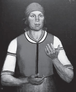 Картина «Художник. Автопортрет» 1933 года написана в тот период, когда Малевич отошел от собственно живописи супрематизма, а затем и пространственных архитектонов, и перешел к предметной фигурации [илл. 48]. Художник представил себя на полотне с сохранением портретного сходства, однако в «маскарадном» обличии – в типологически обобщенном костюме живописца итальянского Возрождения. Погрудное изображение с головой, развернутой в трехчетвертном развороте, и исполненный патетики жест правой руки обладают выраженной семантико-стилистической гетерогенностью. Зоны традиционного для истории европейского искусства, начиная с эпохи Высокого Возрождения, миметического живописного стиля – «натурных» лица, рук и одежды, смешанного колорита и трехмерной глубины «кадра» – противостоят зонам, хранящим память о недавнем супрематическом эксперименте. О последнем сигнализирует открытый цвет (красный берет, красная с белым рубашка, черный верх камзола, красные полоски на рукавах) и акцентированная двухмерность, условность изображения. Композиция построена по законам классической архитектоники и пронизана строгим ритмом: зрительно утяжеленная и отмеченная вертикалью-колонной нижняя часть противопоставлена облегченной горизонтали верхней части (классический принцип дорического ордера), что в сочетании с точкой зрения снизу вверх придает изображению подчеркнутую монументальность. Хотя фон отсутствует, композиция принадлежит к типу построений с низким горизонтом, повышающих статус представленного персонажа/события и тем самым задающих героическую интонацию. Можно согласиться с американской исследовательницей А. Кацнельсон, которая в своем рассмотрении «Автопортрета» Малевича указывает на иносказательный пласт смысла – тему вождя, которую автор намеревался скрыть от цензуры [Katsnelson 2006]. Аналогичный тип композиции мы встречаем в поздней крестьянской серии художника – в полных трагической экспрессии бородатых персонажах на фоне удаленного пейзажа.