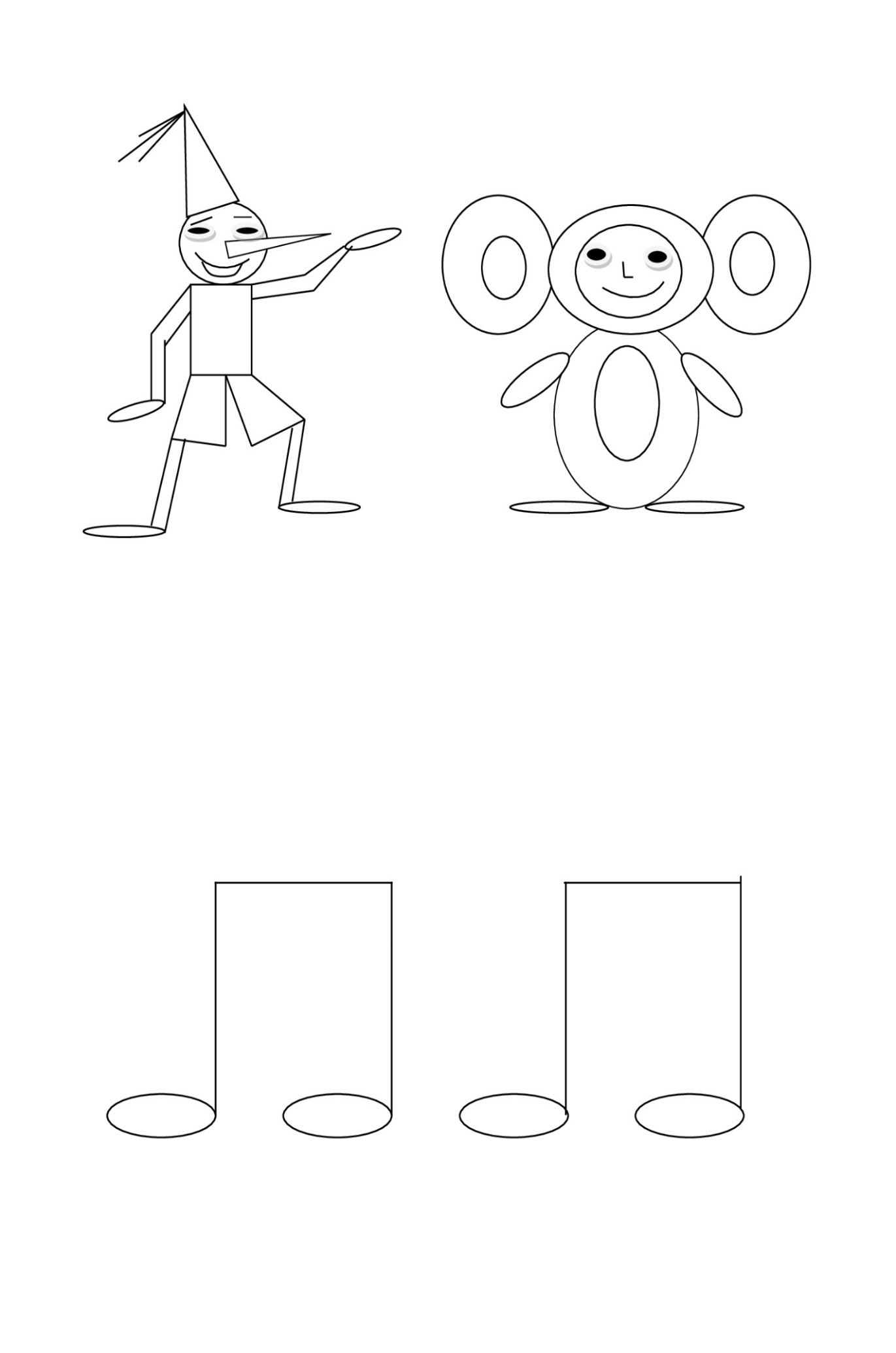 Прохлопаем ритм. Раскрасим ноты в разные цвета: «ФА» – зелёный, «МИ» – синий, «РЕ» – жёлтый, «ДО» – красный. Споем песенку нотами, а затем со словами.