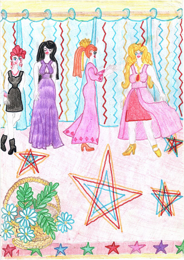 Внимание её привлекли вешала с женской одеждой, стоявшие в глубине сцены. Тут же находились два больших зеркала в полный рост человека. Надо было торопиться на выход, но устоять против искушения посмотреть на наряды девушка не смогла. Она начала перебирать плечики с красивыми платьями.