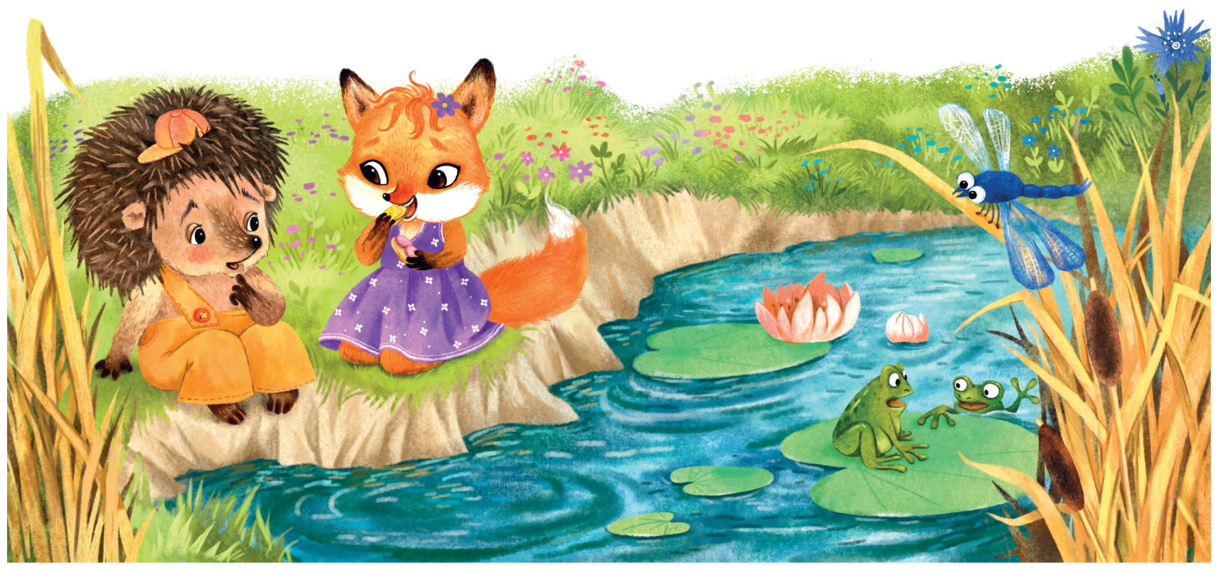 Круги по воде, кваканье лягушек, стрекозы с выпученными глазами – это же идеальная картинка весенне-летней жизни! Ли мог часами сидеть на берегу. Поньке же становилось скучно. Ей хотелось бежать, нестись и карабкаться. Но за вкусные бутерброды, которые Ли принёс с собой, она могла и полюбоваться на этих самых стрекоз.