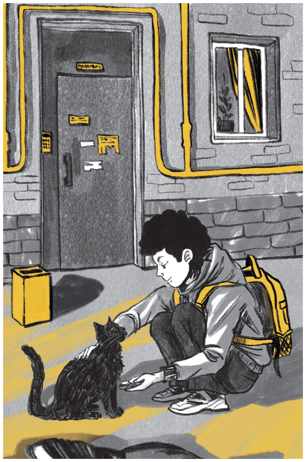 У подъезда Петьку встретил чёрный кот. Видимо, Петькино лицо было очень печальным, поэтому кот не стал переходить ему дорогу. Сидел, и ждал, когда мальчик сам к нему подойдёт, чтобы погладить.