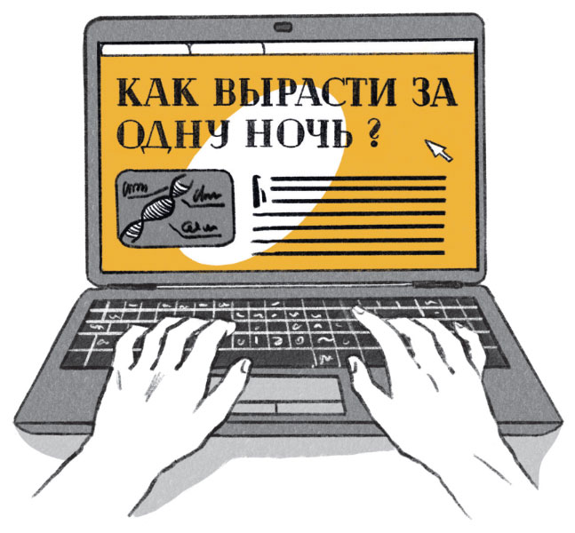 Но Петька его уже не слушал. Это что, ещё два года терпеть? Он закрылся в своей комнате и набрал в поисковой строке: «Как вырасти за одну ночь».