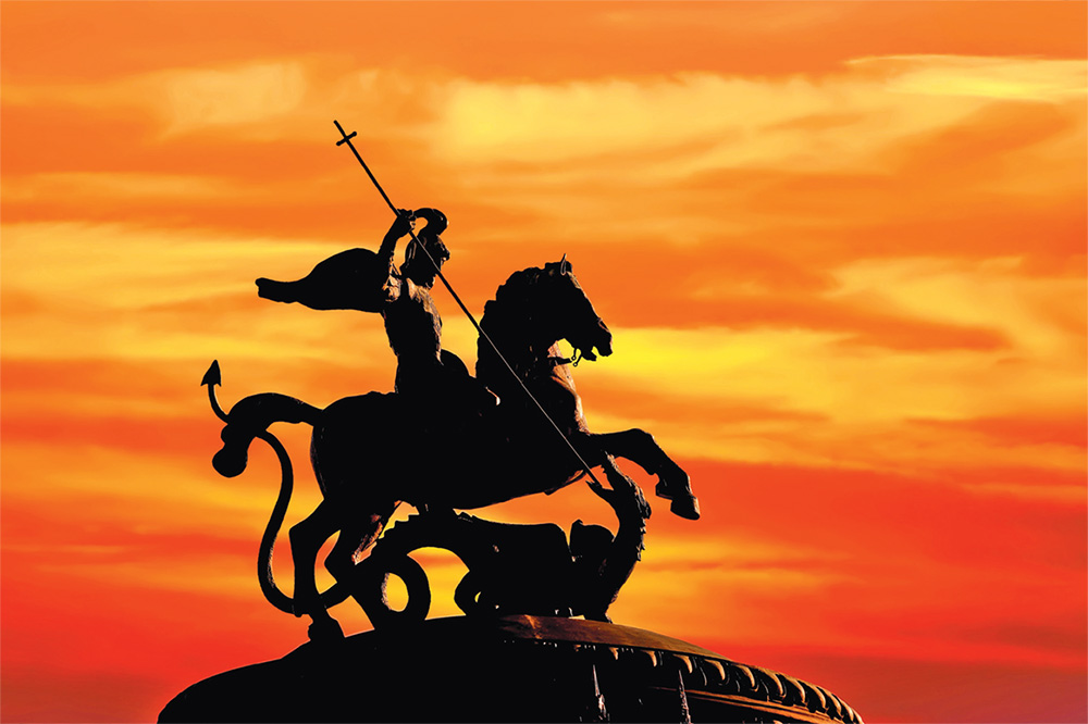 Стенания услышал проезжавший мимо святой Георгий. Он пообещал, что избавит бедную девушку и других людей от страшного чудовища. И вот наш герой предстал перед жутким монстром. Осенив себя крестным знамением, этот смелый воин поразил змея копьём. Увидев спасённую дочь и убитое чудовище, царь и весь его народ возликовали. Они решили принять христианство, которое помогло победить дракона.